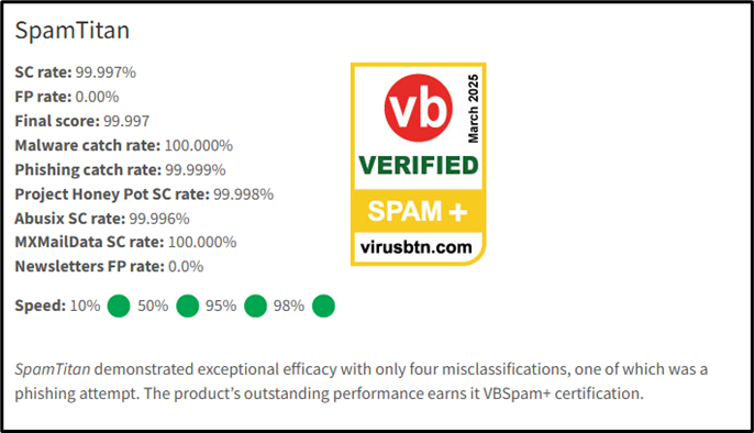 The MX flagship email security gateway solution sits outside the inbox/M365 environment, providing a 99.99% spam catch rate with a 0.003% false positive rate.